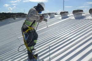 Jateamento de tintas no telhado para evitar vazamentos e reduzir a temperatura interna em ambientes fabris
